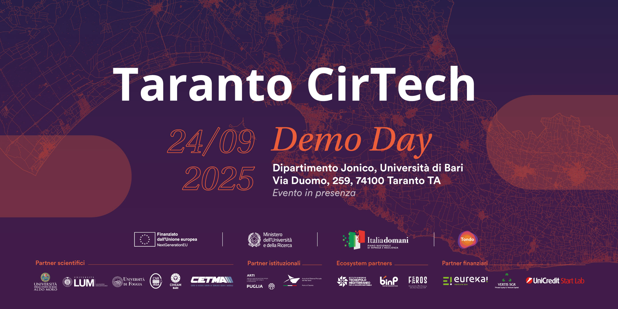 On September 24, 2025, the Ionian Department of the University of Bari will host in Taranto the final Demo Day of Taranto CirTech, the acceleration program promoted by Tondo as part of the Italian PNRR and the MUSA Ecosystem, aimed at supporting circular innovation in Southern Italy.